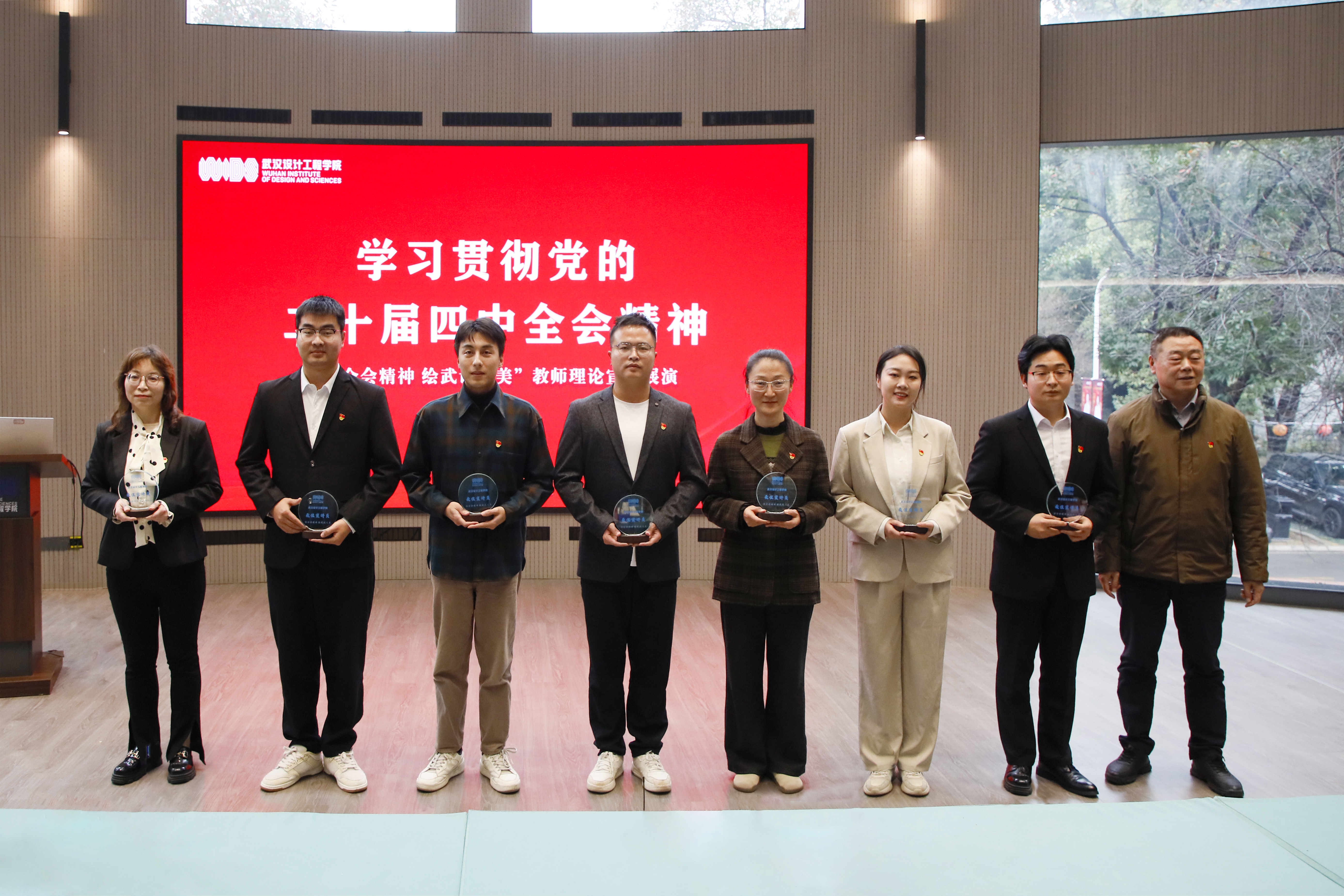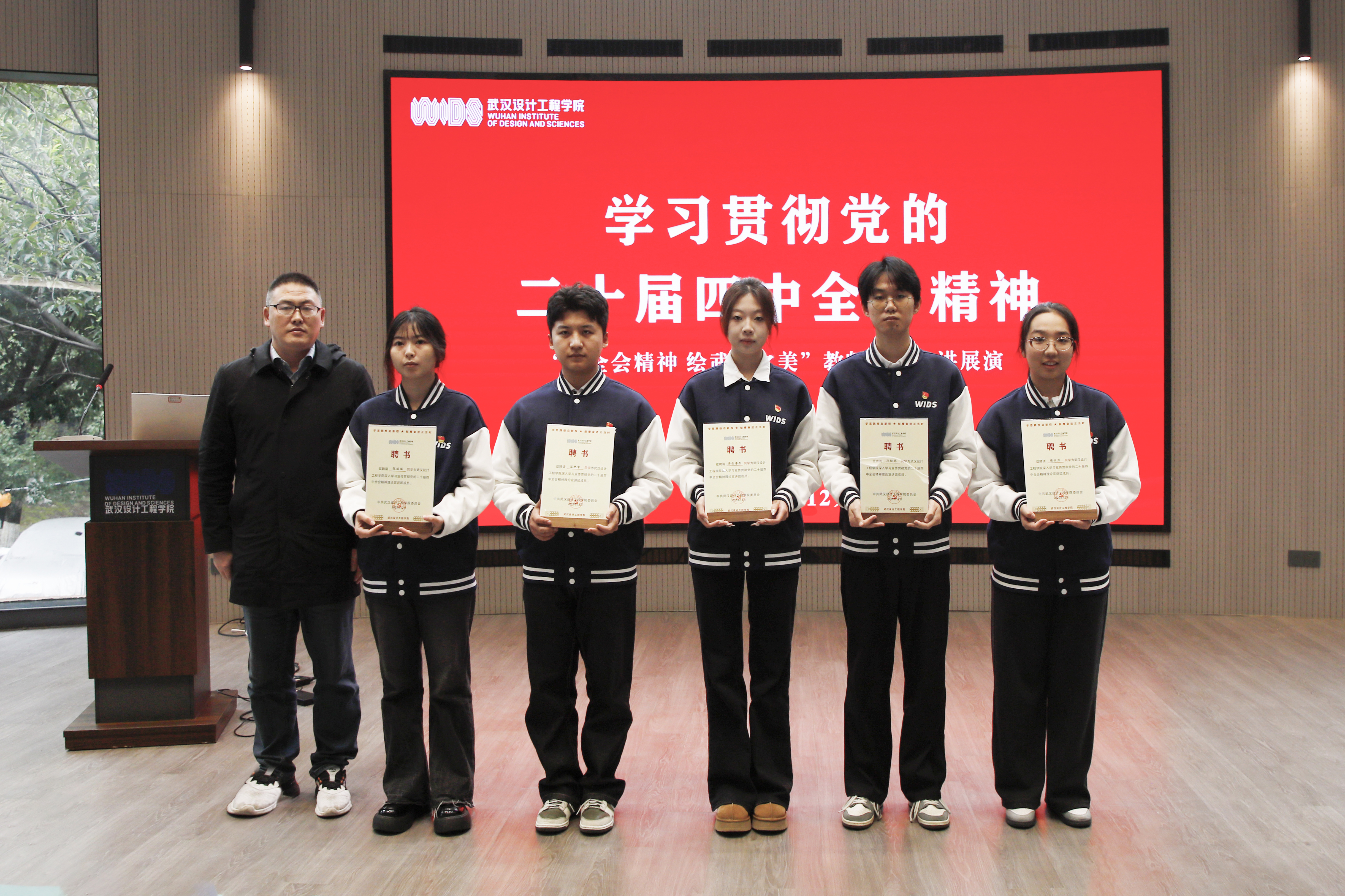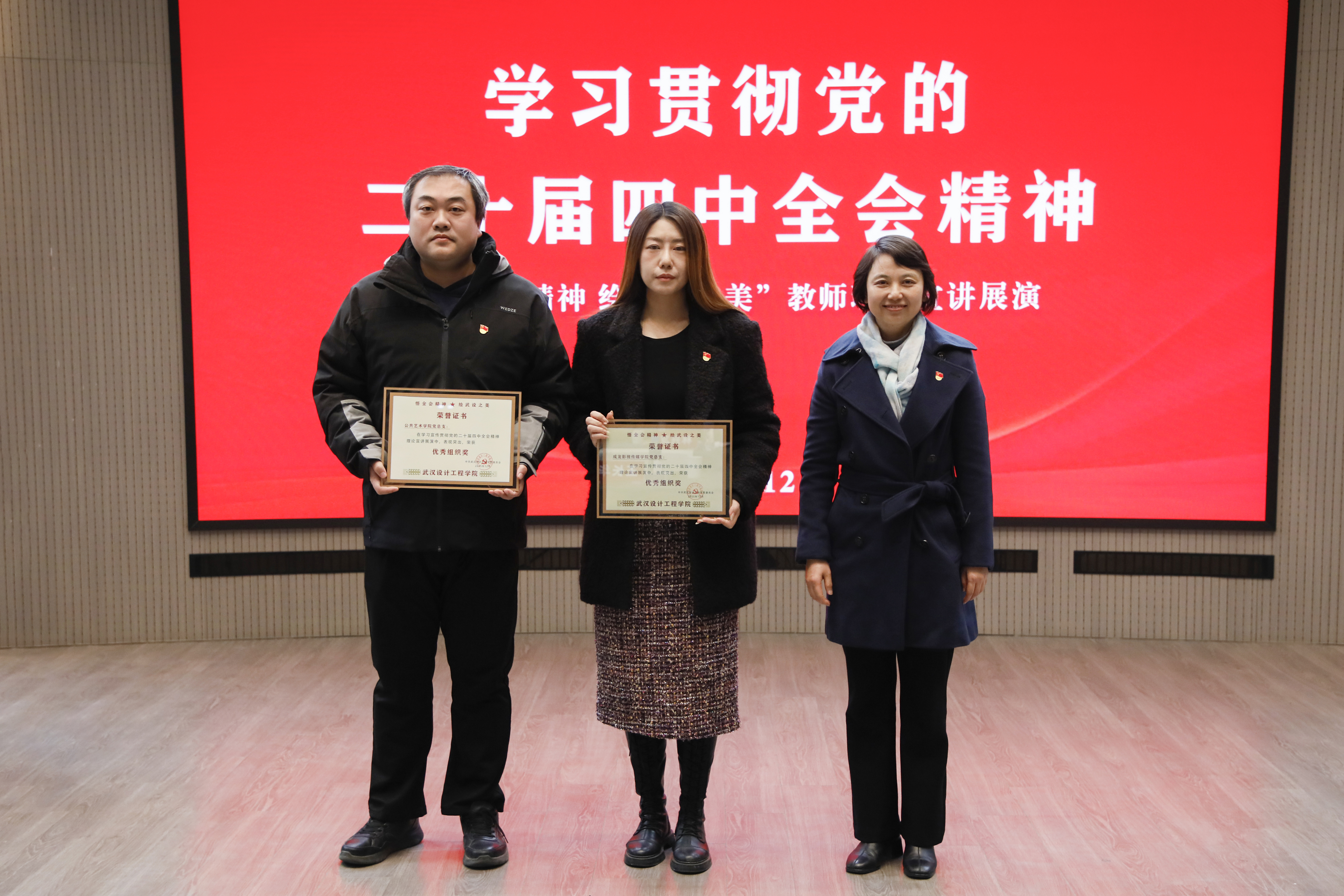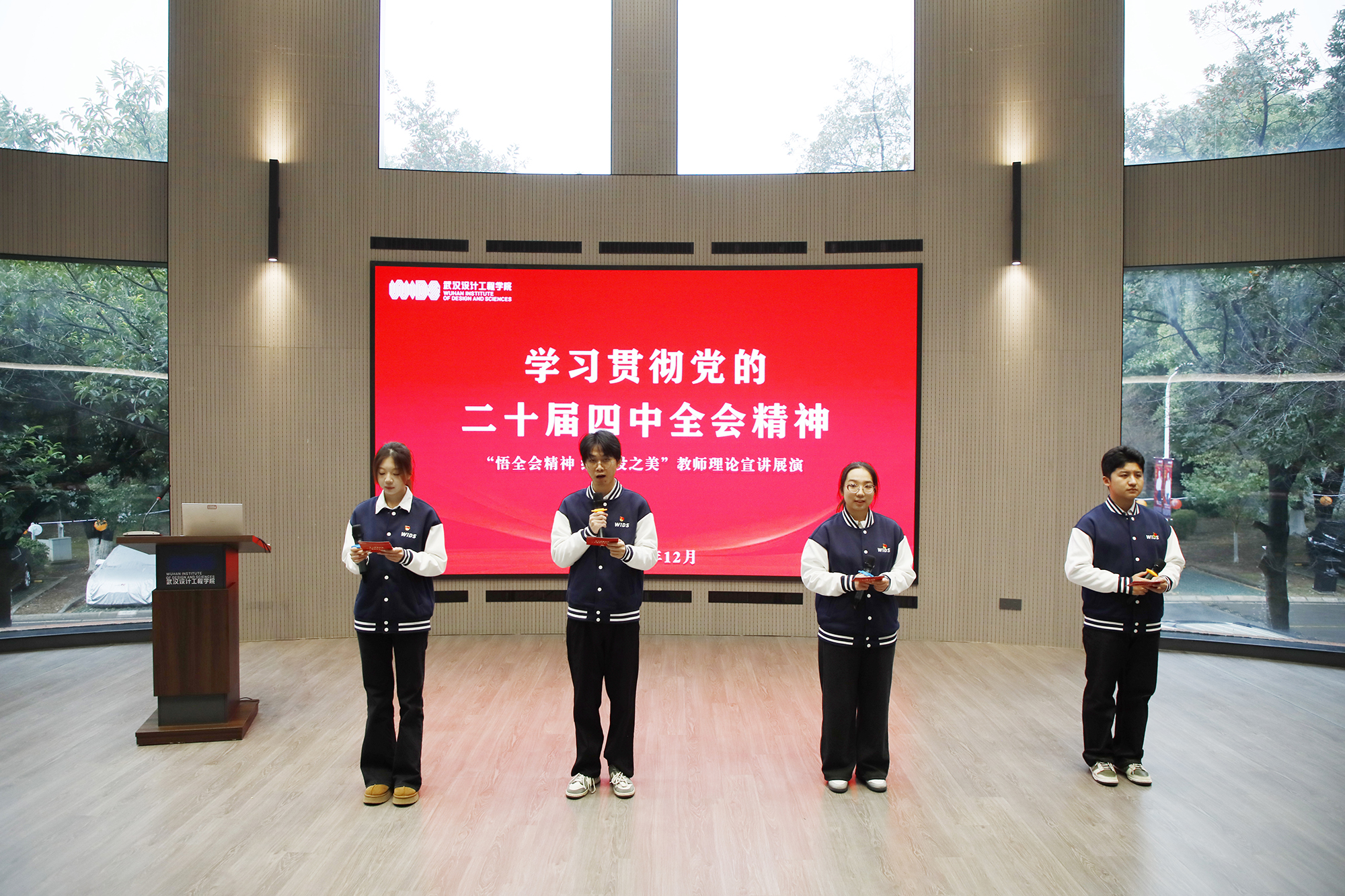 本网讯(记者 陈维)12月23日,学习贯彻党的二十届四中全会精神教师理论宣讲展演在学校得一堂一楼报告厅举行,标志着武汉设计工程学院“理响武设”宣讲团正式成立。学校党委书记王长华、校长龚少平、副校长徐拥华,华中师范大学党委宣传部副部长叶雷出席并担任评委。