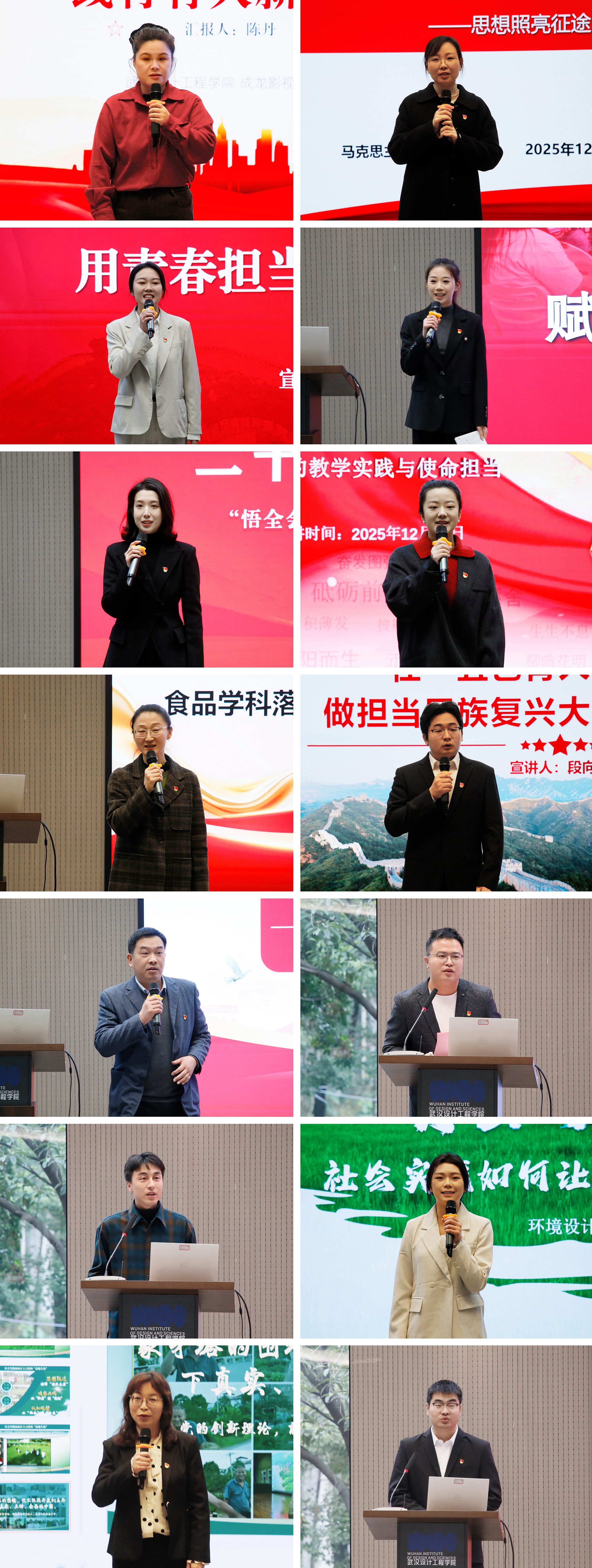 展演现场,宣讲团学生成员代表融专业所长、实践经历于一体,分享了学习全会精神的感悟。14位来自各党总支、直属党支部的老师依次登台,紧扣“悟全会精神 绘武设之美”主题,鲜活讲述中国故事、武设故事,尽显学校“行走的课堂”独特韵味,将学习成果切实转化为生动实践。