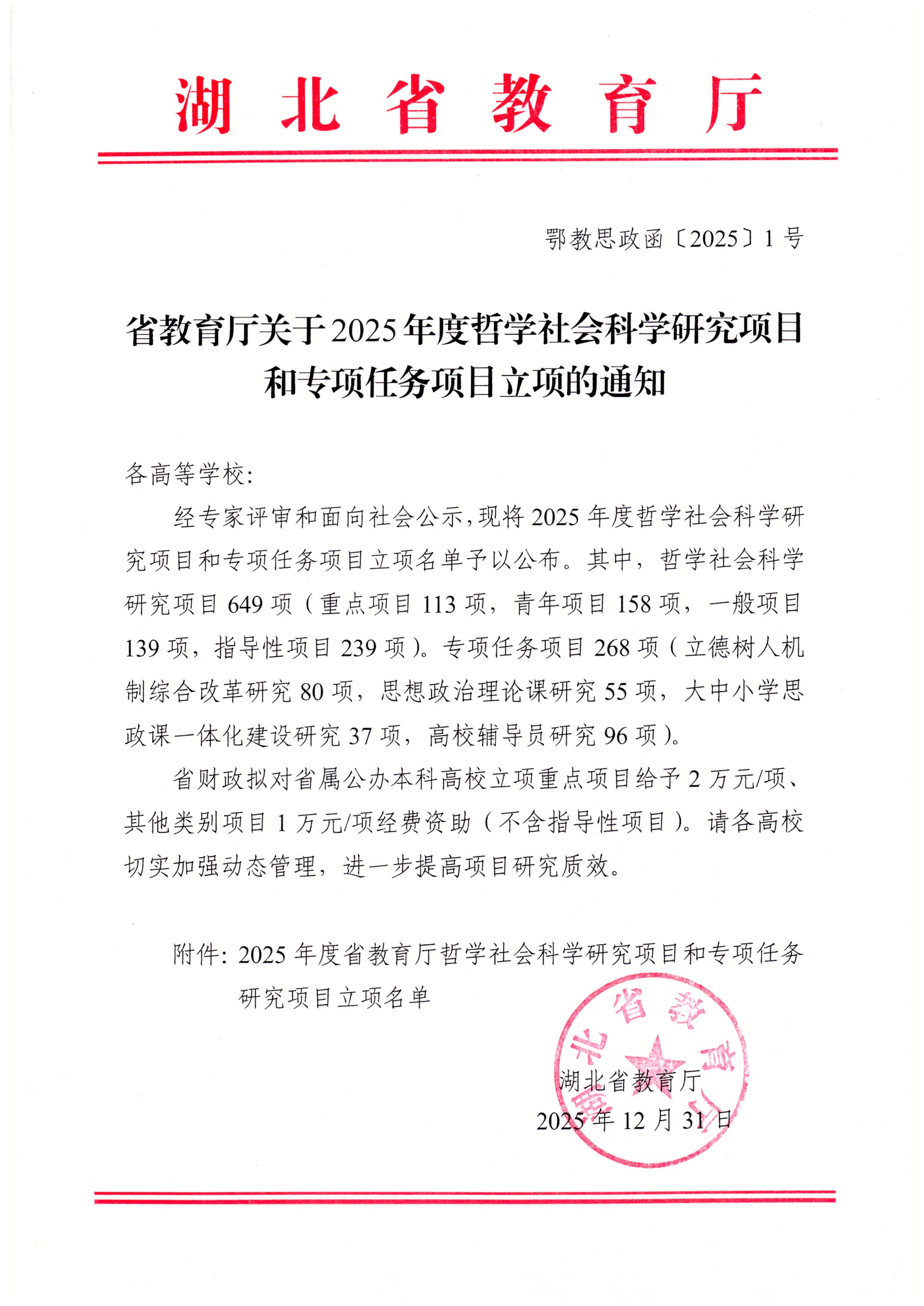 本网讯(通讯员 陈文敬)近日,湖北省教育厅公布了2025年度哲学社会科学研究项目和专项任务项目立项名单,我校共有7项课题获批立项,其中指导性项目6项、思想政治理论课研究项目1项。
