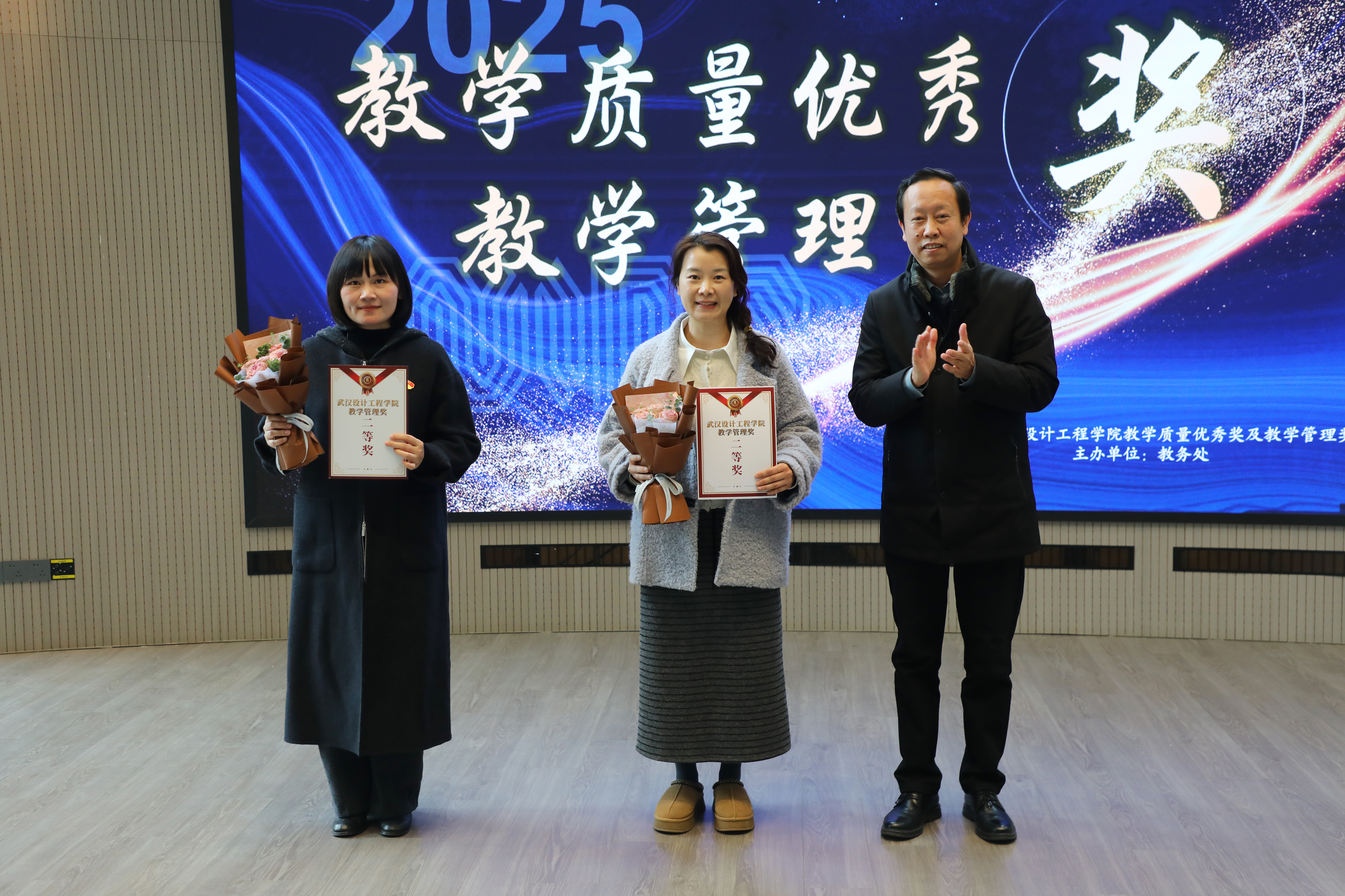 本网讯(通讯员 郑格格)1月9日,我校2025年教学质量优秀奖及教学管理奖评定活动在得一堂一楼报告厅顺利举行。学校党委书记王长华、副校长徐拥华出席活动并为获奖教师颁奖。