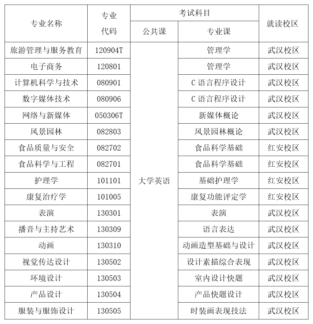 各专业考试信息参见《武汉设计工程学院2026年普通专升本考试信息表》(附件1),考试大纲参见《武汉设计工程学院2026年普通专升本考试大纲》(附件2)。