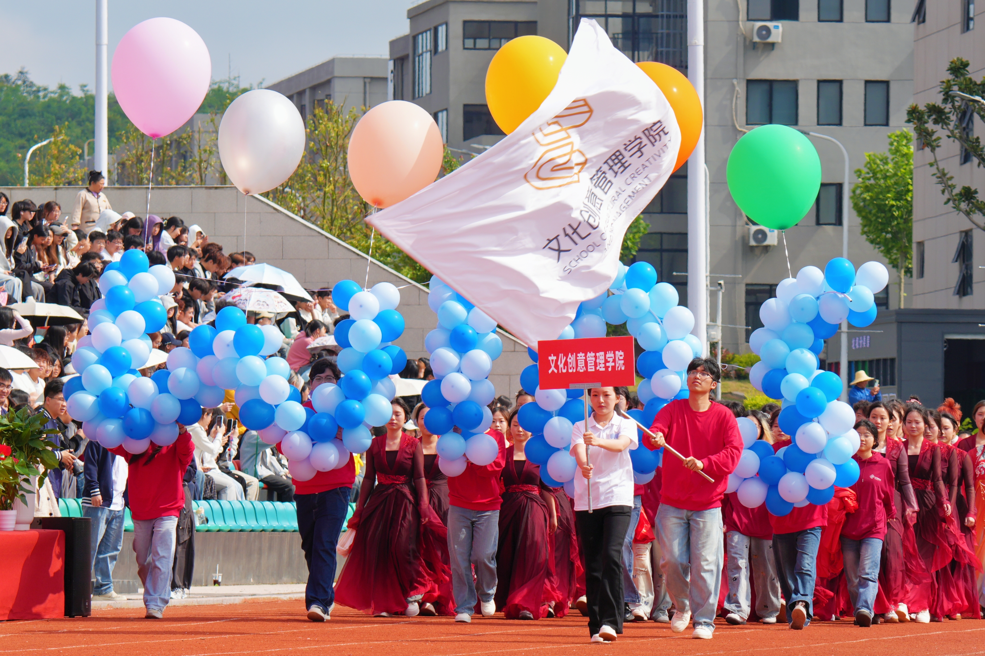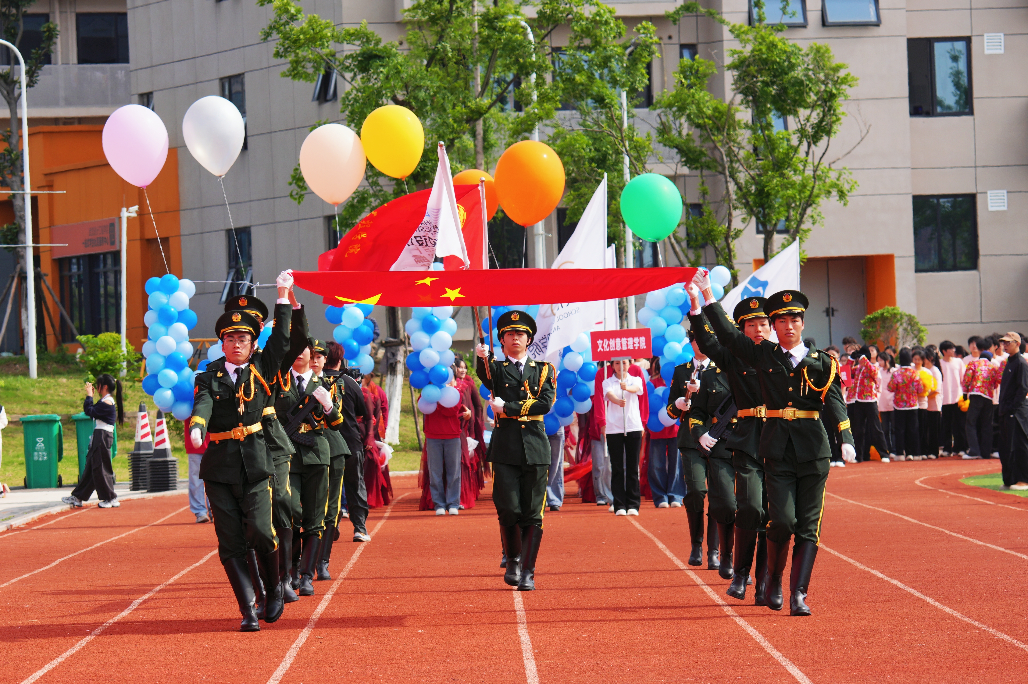 上午9:30,运动会开幕式在激昂的《运动员进行曲》中拉开帷幕。国旗护卫队身姿挺拔、目光坚毅,守护着鲜艳国旗庄严前行。各学院方阵紧随其后,尽展武设学子的青春锋芒。