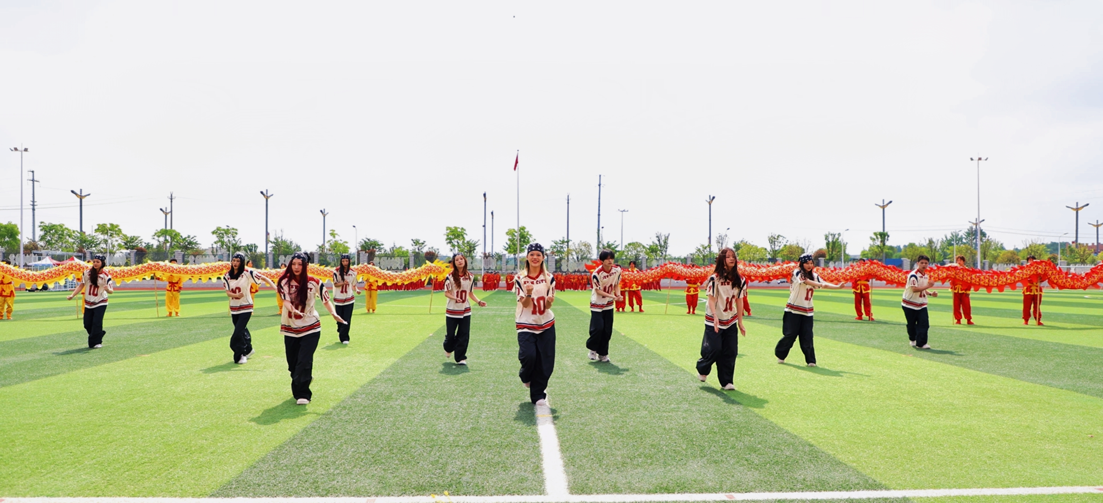 各方阵创意满满、特色鲜明,红色主题、民族歌舞、科技元素、创意队形、特色演绎轮番呈现,融汇专业特色与青春朝气,风采各异、亮点纷呈。气势恢宏的英歌舞刚劲豪迈、气势磅礴,铿锵舞步燃动全场。
