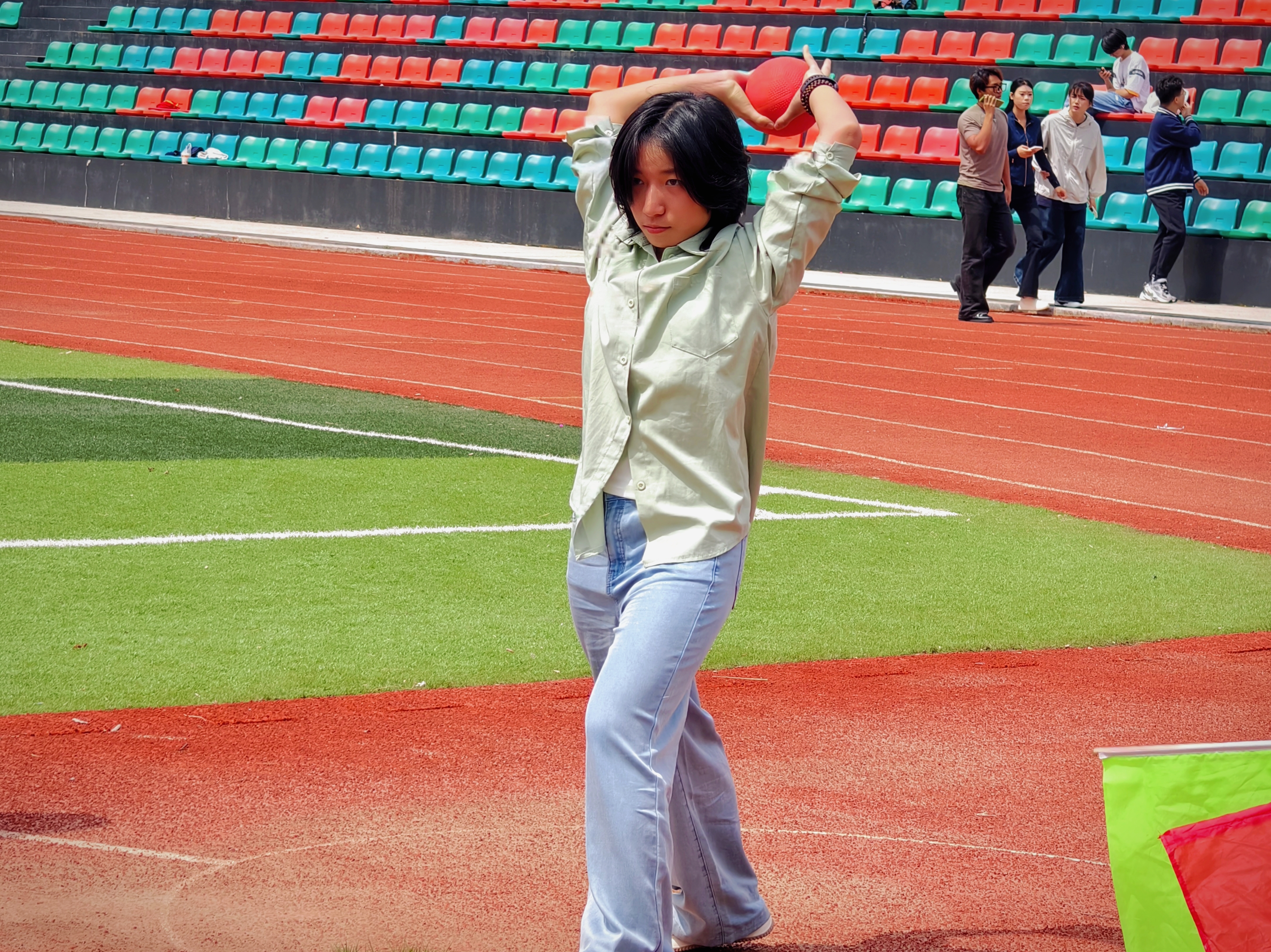田赛赛场同样精彩纷呈。跳高选手助跑、起跳、腾空过杆,不断挑战极限,尽显力与美;实心球选手奋力投掷,球影破空而出,展现青春力量。
